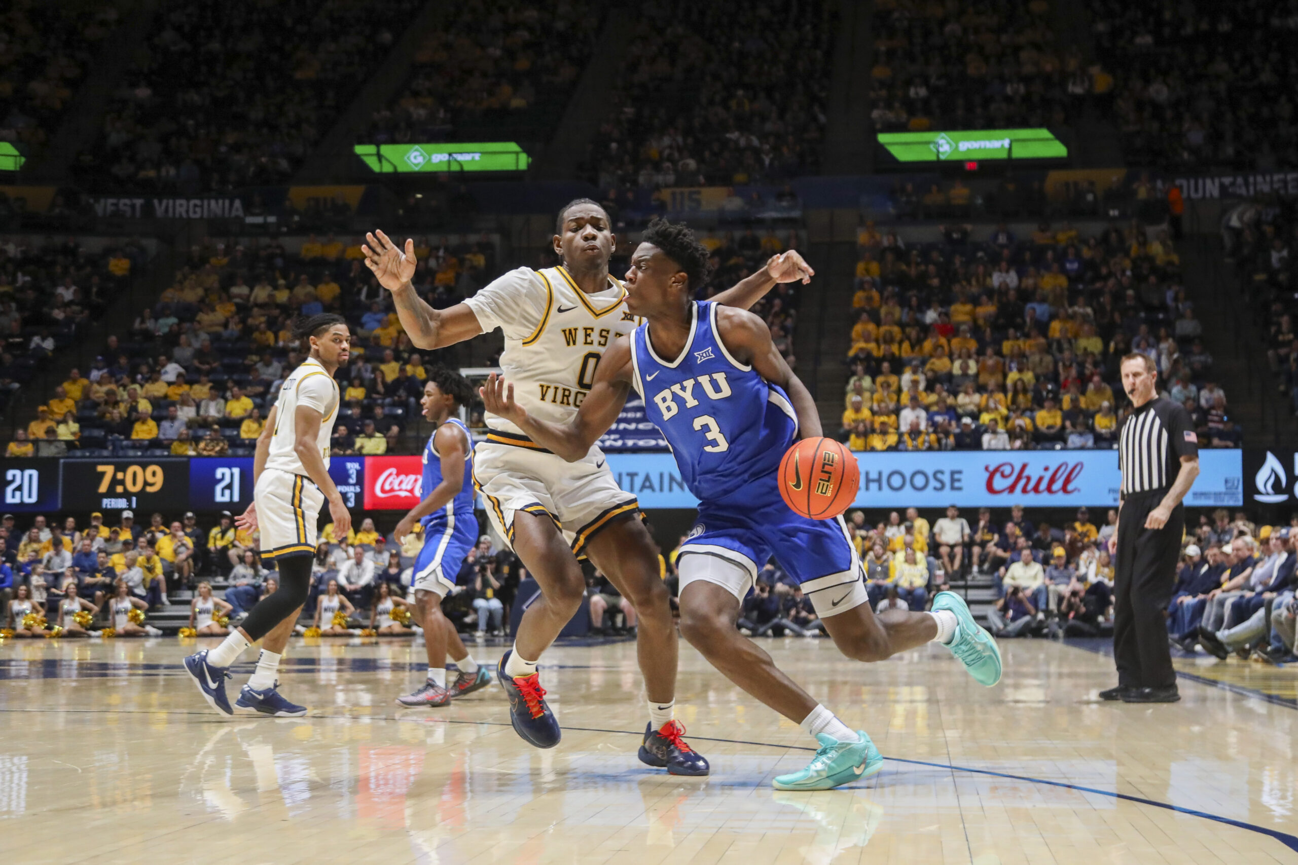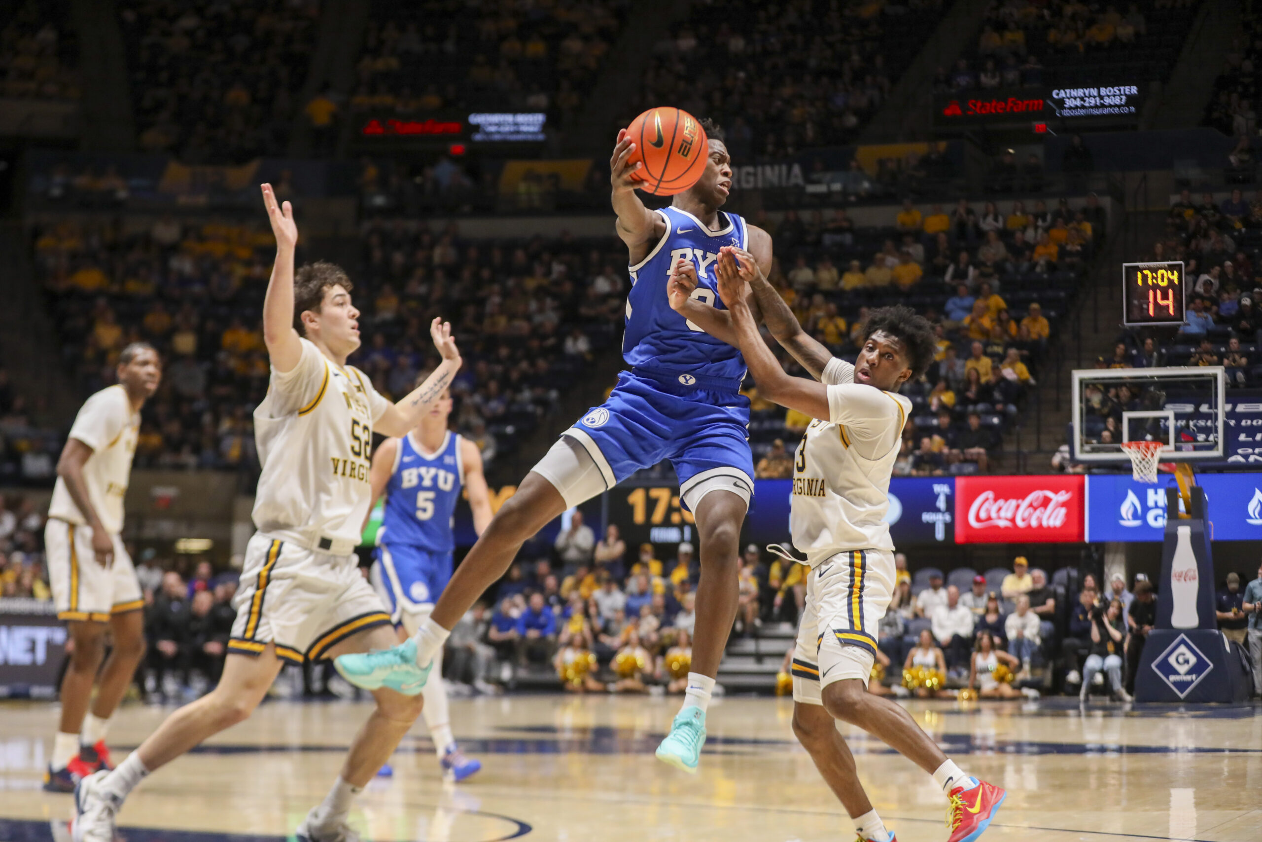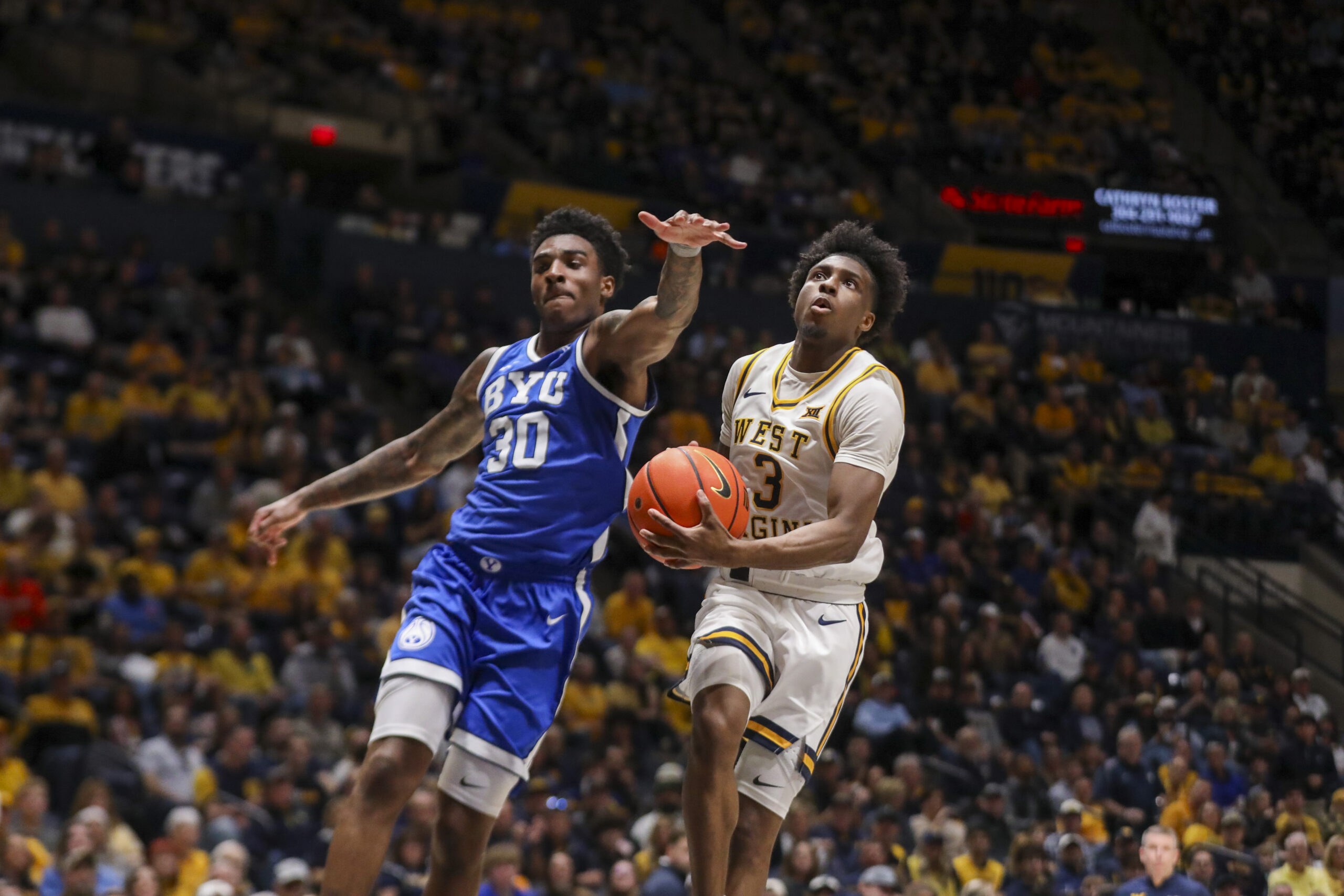 The Mountaineers (17-12, 8-8) led by three with inside 1 minute remaining and the Cougars came up with a steal that put them in position to tie or draw closer. But only three seconds after BYU (20-9, 8-8) gained possession, Chance Moore sprinted back on defense and forced a Keba Keita turnover.
